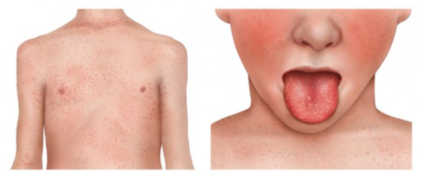 The rash of scarlet fever often begins with small spots on the body that then spread to the neck, arms and legs over the next 1-2 days. It is often 'sand-paper' like to touch but is not itchy.